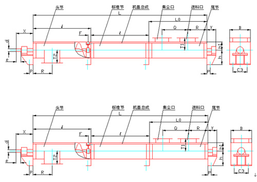 由于設(shè)計(jì)的螺旋輸送機(jī)的長度為12米。為了制造,安裝以及運(yùn)輸?shù)姆奖?span>,其槽體和螺旋軸均采取分節(jié)制造,頭節(jié)長2.5米,接著是2.5米、2米、2.5米長的中間節(jié),尾節(jié)長2.5米,靠螺栓聯(lián)接,并用中間軸承支承。同時(shí),為了_分節(jié)裝配后輸送機(jī)的整體剛度,槽體的連接處和螺旋軸的連接處需分開一段距離。由于物料在螺旋輸送機(jī)